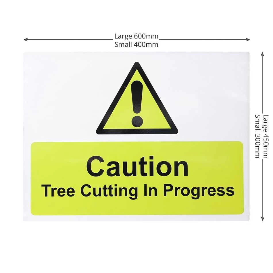 - ‘Tree Cutting in Progress’ wording below a black, hazard triangle on bright yellow background
